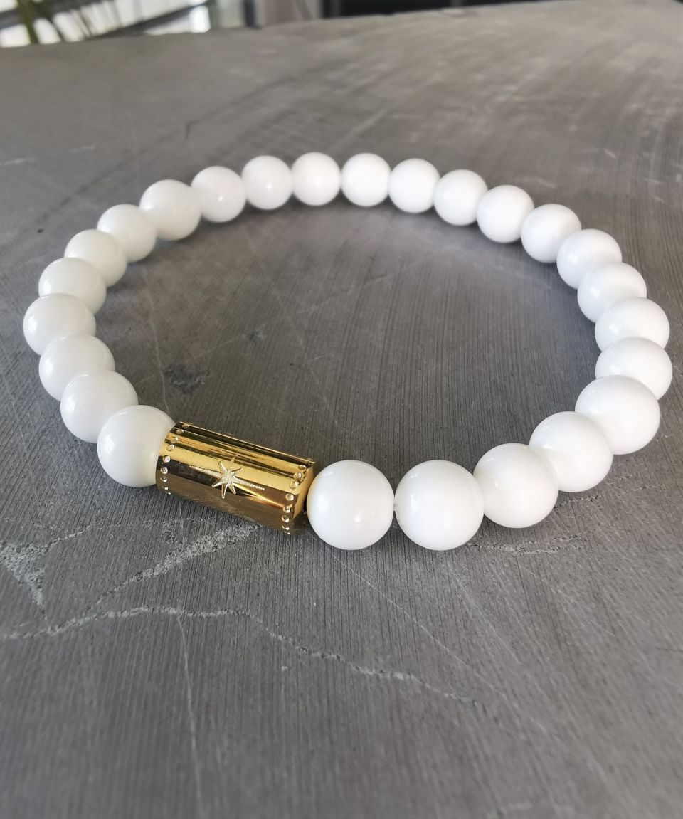 - Matériaux : Pierre de coquillage blanches & cylindre doré décoré d’une étoile en inox